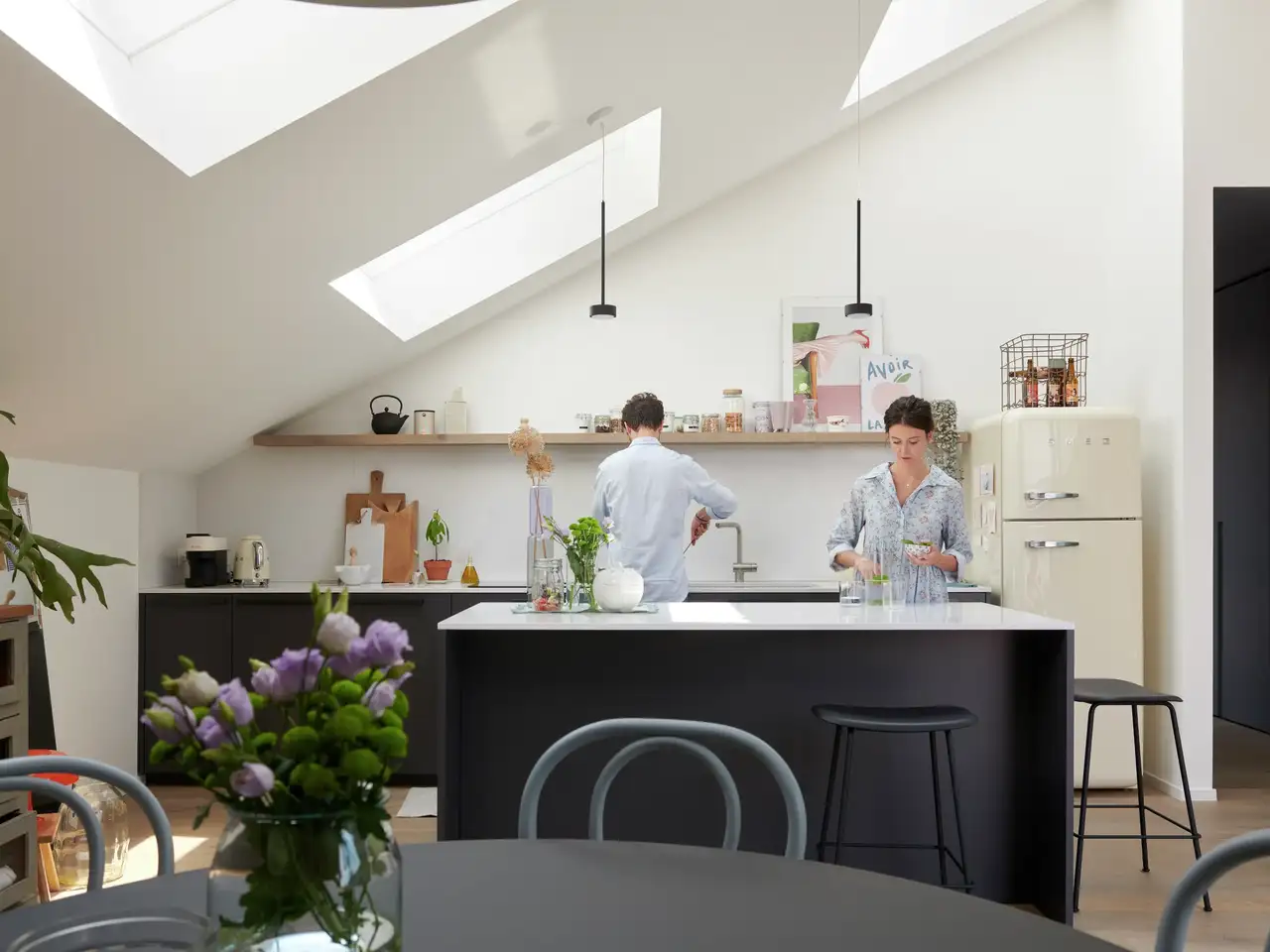 Notre conseil: exploitez la profondeur d’une fenêtre de toit pour créer un plan de travail baigné de lumière du jour. Pétrir la pâte tout en laissant vagabonder son regard au loin, ou comment conjuguer bonne cuisine et qualité de vie.