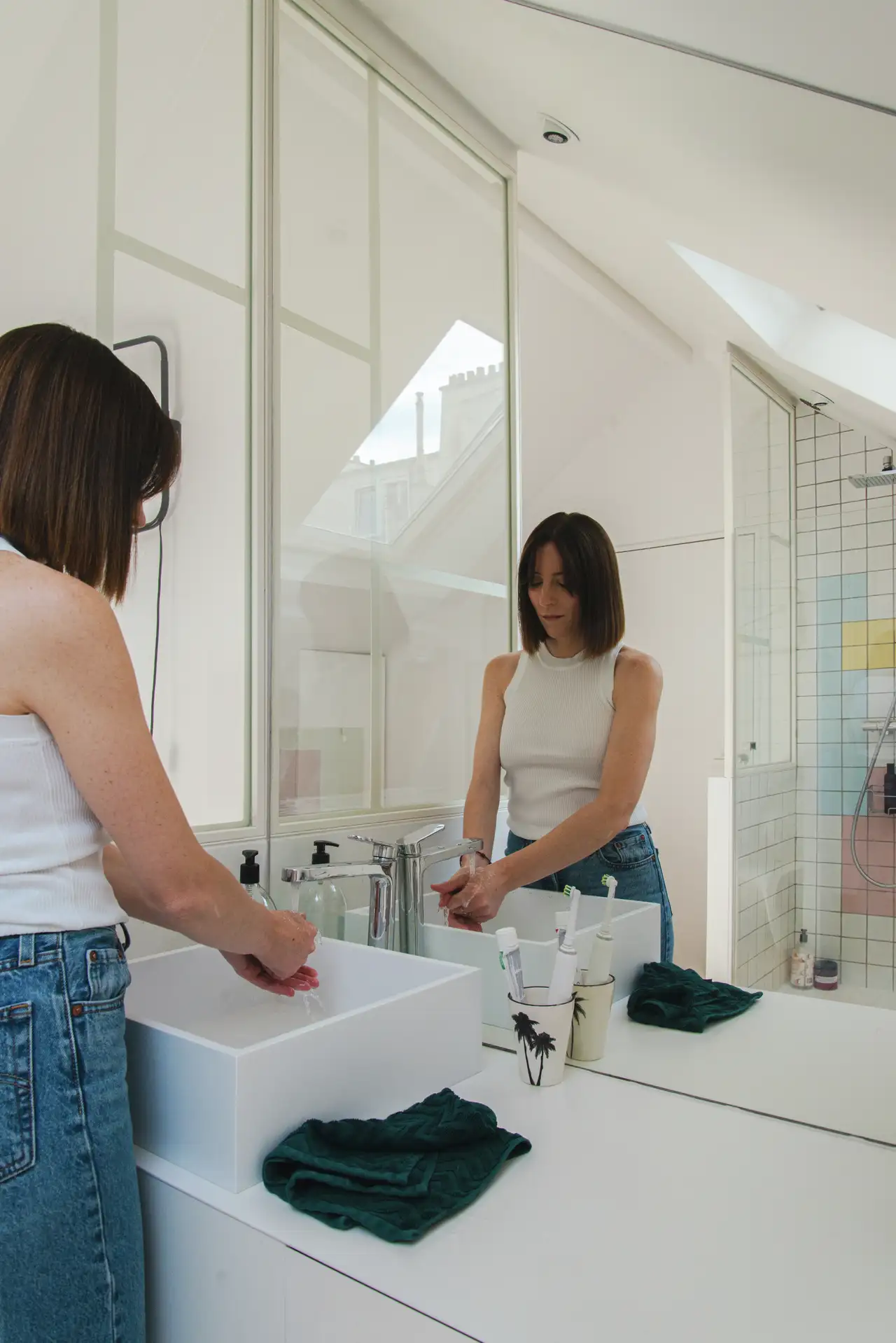 Bagno moderno e spazioso con doccia sotto il tetto spiovente.