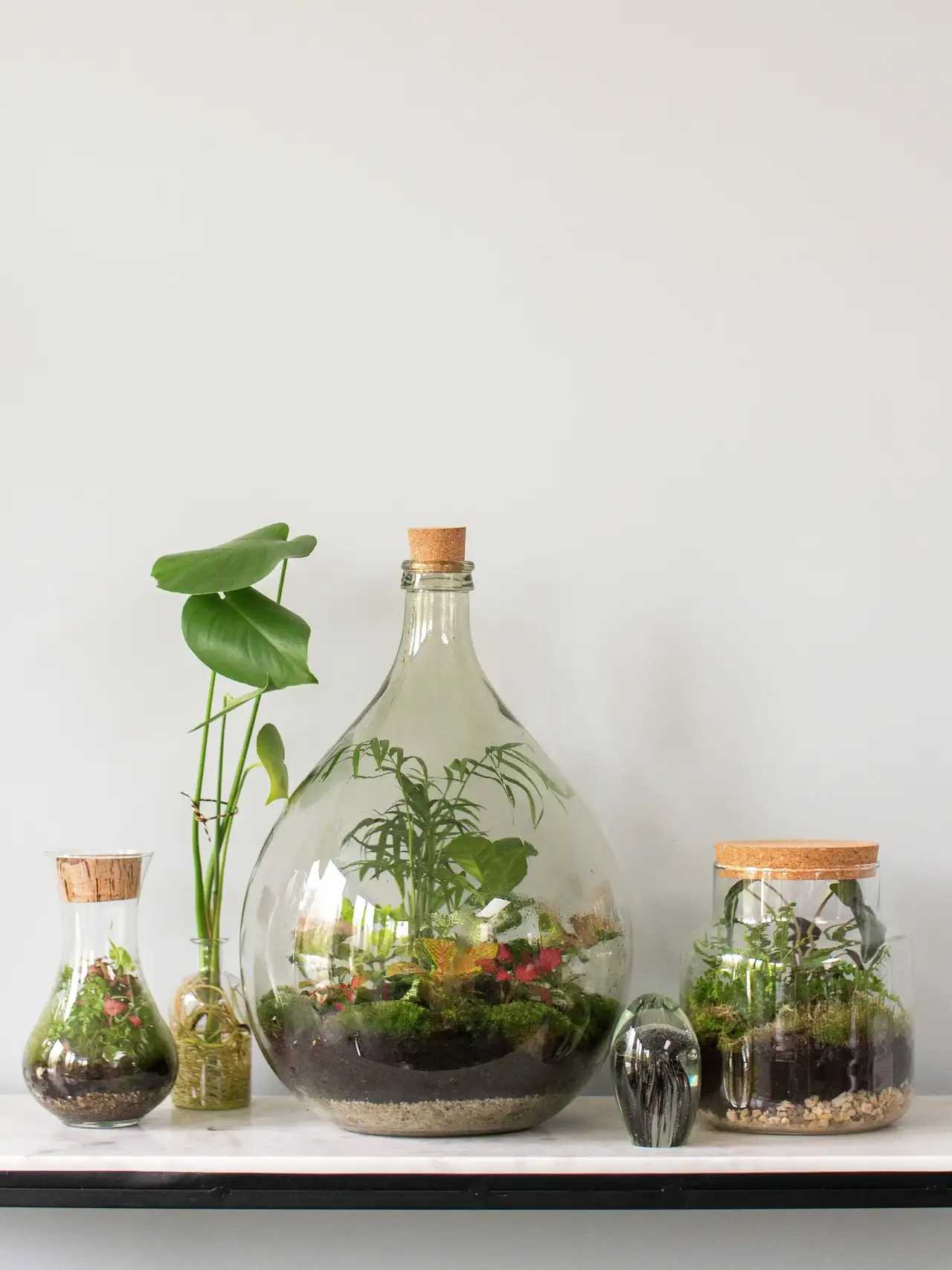 Oltre alla giusta collocazione, anche i contenitori di vetro adatti e la scelta corretta del tipo di piante contribuiscono in maniera determinante alla riuscita del giardino in miniatura. Le piante adatte sono quelle che richiedono un clima caldo-umido e che crescono piuttosto lentamente.